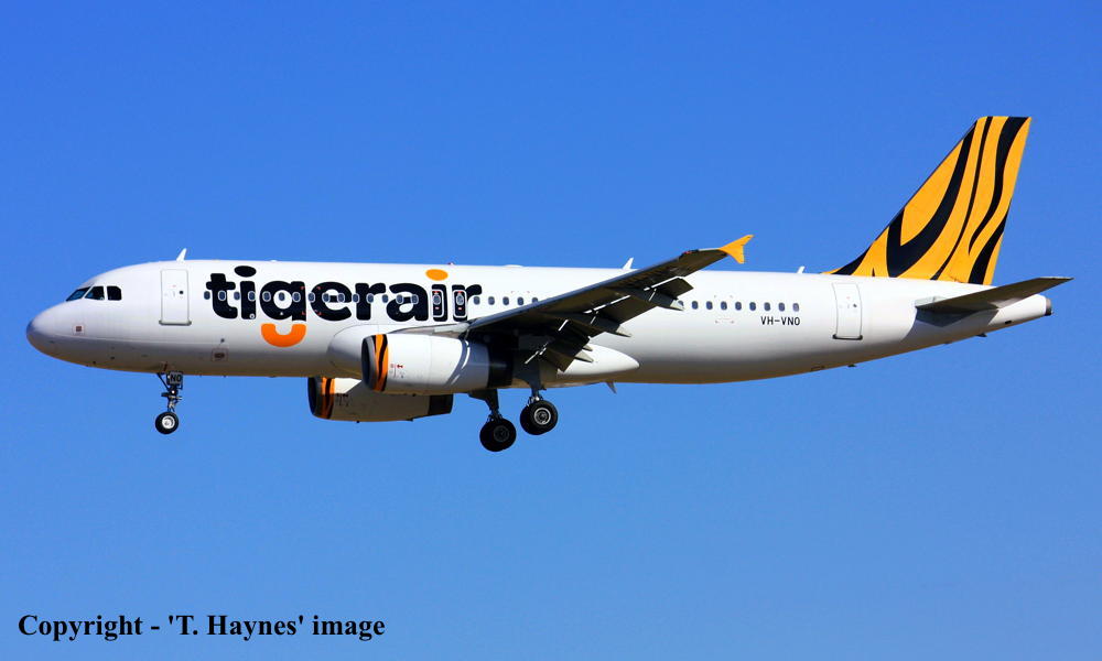 VH-VNO. Tigerair - in the standard livery at Adelaide West Beach Airport, September 23, 2018. (T. Haynes Copyright Image 0321-369.) |