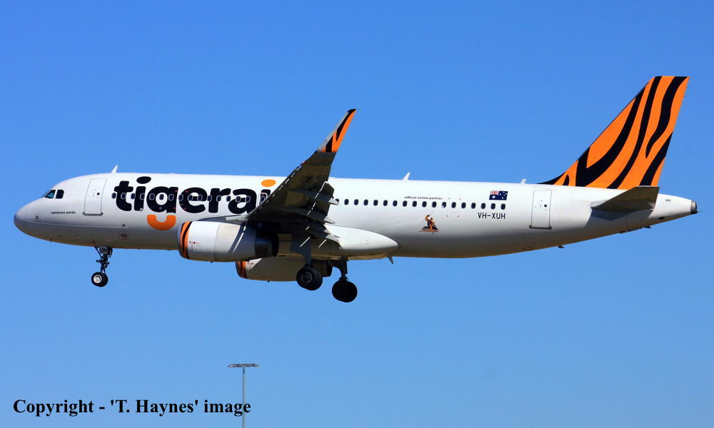 VH-XUH. Tigerair - in the standard livery at Sydney Kingsford Smith Airport, February 01, 2016. (T. Haynes Copyright Image 0320-561.) |