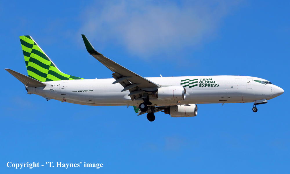 This aircraft was ordered new by XL Airways UK - ? Rolled off the Boeing production line at Seattle (Renton) - December 2006 It was fitted with winglets First flown at Seattle (Renton) - January 02, 2007 Powered by CFM International CFM56-7B26 engines Entered onto the British Aircraft Register as G-XLAK (CofR G-XLAK/R1) - January 26, 2007 Registered to XL Airways UK Ltd, London Accepted by XL Airways at Seattle (Boeing Field) - January ?, 2007 It was withdrawn from service by XL Airways - September 12, 2008 Reregistered as G-XLAK (CofR G-XLAK/R2) - September 17, 2008 Registered to MCAP Europe Ltd, Dublin, Ireland Cancelled from the British Aircraft Register - December 05, 2008 Entered onto the Turkish Aircraft Register as TC-JHI - December 06, 2008 Registered to Turkish Airlines, Istanbul, Turkey The aircraft did not enter service with Turkish Airlines Leased to AnadoluJet, Turkey as the registered operator - December 06, 2008 Withdrawn from service by AnaduloJet and returned to Turkish Airlines - January 19, 2013 Reregistered as TC-SAH - January 19, 2013 Registered to Sun Express, Antalya, Turkey Leased to AnaduloJet as the registered operator - January 19, 2013 Withdrawn from service by AnaduloJet and returned to Sun Express - November 12, 2018 Cancelled from the Turkish Aircraft Register - June 21, 2019 Entered onto the Georgian Aircraft Register as 4L-TGC - June 21, 2019 Registered to Georgian Airways, Tbilisi, Georgia Withdrawn from service by Georgian Airways at Tbilisi - November 02, 2021 Cancelled from the Georgian Aircraft Register - November 04, 2021 Entered onto the Armenian Aircraft Register as EK-73792 - November 04, 2021 Registered to Air Dilijans, Yerevan, Armenia Delivered to Air Dilijans at Yerevan - November 05, 2021 Withdrawn from service by Air Dilijans at Yerevan - May 09, 2022 Cancelled from the Armenian Aircraft Register - June 01, 2022 Entered onto the Czech Aircraft Register as OK-SBK - June 01, 2022 Registered to CSA Czech Airlines, Prague, Czech Republic Withdrawn from service by CSA Czech Airlines at Prague - July 21, 2023 Cancelled from the Czech Aircraft Register - July 21, 2023 Entered onto the United States Aircraft Register as N736CE - July 21, 2023 Registered to Arena Aviation Capital, Amsterdam, Netherlands Departed Prague (Czech Republic) on the ferry flight to Guangzhou (China) - July ?, 2023 It arrived at Guangzhou (China) for conversion to an 'all-freight' configuration - July 16, 2023 Conversion completed as a Boeing 737-8FH(F) - May ?, 2024 Leased to Texel Air New Zealand as the registered operator - May 24, 2024 Departed China (Guangzhou - 01:36) on the delivery flight to New Zealand - May 24, 2024 It arrived at Auckland (17:57 NZST) on completion of the delivery flight from China - May 24, 2024 Ferried Auckland - Hamilton - May 24, 2024 Delivery route: Guangzhou (China) - Port Moresby (Papua New Guinea) - Auckland - Hamilton It was painted into the 'Team Global Express' livery and named 'Sally' Entered onto the New Zealand Aircraft Register as ZK-TXD - June 05, 2024 Registered to Texel Air New Zealand, Auckland Cancelled from the United States Aircraft Register - June 06, 2024 Ferried Hamilton - Brisbane as TNZ? - June 17, 2024 Entered service Brisbane - Melbourne (Tullamarine) as TFX601 - June 21, 2024 Texel Air' is now commonly referred to as 'Texel Air Australasia' Flights using the prefix 'TNZ' are operated by Texel Air Australasia (previously Texel Air New Zealand) Flights using the prefix 'TFX' are operated by Texel Air Australasia on behalf of Toll Priority Current with Texel Air Australasia |