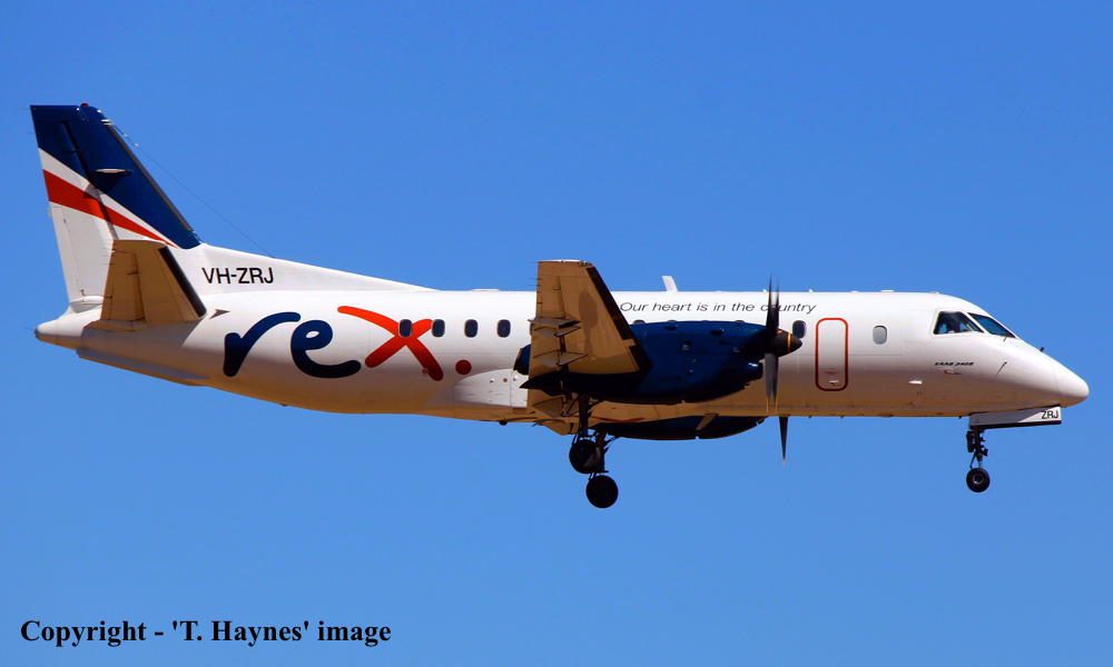 This aircraft was built by Saab Aircraft AB, Linkoping, Sweden - 1996 First flown with the test registration 'SE-C96' - May 13, 1996 Powered by General Electric CT7-9B turboprop engines Entered onto the United States Aircraft Register as N396AE - June ?, 1996 Registered to First Security Bank, USA Leased to American Eagle as the registered operator Delivered to American Eagle - June 22, 1996 The aircraft was badly damaged by hail at Dallas (Fort Worth) - April 05, 2003 It was ferried from Dallas (Fort Worth) to Abilene (Texas) for repairs - April 10, 2003 The aircraft had flown a total of 13,110 hours to date It was observed back in service with American Eagle at Dallas (Fort Worth) - June 23, 2003 The aircraft was withdrawn from service by American Eagle - August 14, 2007 It was observed stored at Abilene (Texas) - April 2008 It was officially returned to the lessor - October 15, 2008 It was ferried Abilene - Nashville (Tennessee) for maintenance and further storage - March 13, 2009 It was observed stored at Nashville (Tennessee) in the 'American Eagle' livery - June 12, 2009 Leased to REX Airlines Australia - October 16, 2009 Departed Nashville (Tennessee) on the delivery flight to Australia - October 16, 2009 It arrived at Wagga Wagga on completion of the delivery flight from the United States - October 20, 2009 Ferry route: Nashville - Yuma - Christmas Island - Apia - Gold Coast - Orange - Wagga Wagga Cancelled from the United States Aircraft Register - October 20, 2009 Entered onto the Australian Aircraft Register as VH-ZRJ - October 20, 2009 Registered to Regional Express, Forrest Hill, NSW Operated its first revenue service Wagga Wagga - ? - December 16, 2009 Registered to REX Investment Holdings Pty Ltd, Sydney - March 25, 2014 Registered to REX Investment Holdings Pty Ltd, Mascot, Sydney - April 13, 2019 Leased to Regional Express Pty Ltd, Mascot, Sydney as the registered operator Current with Regional Express |