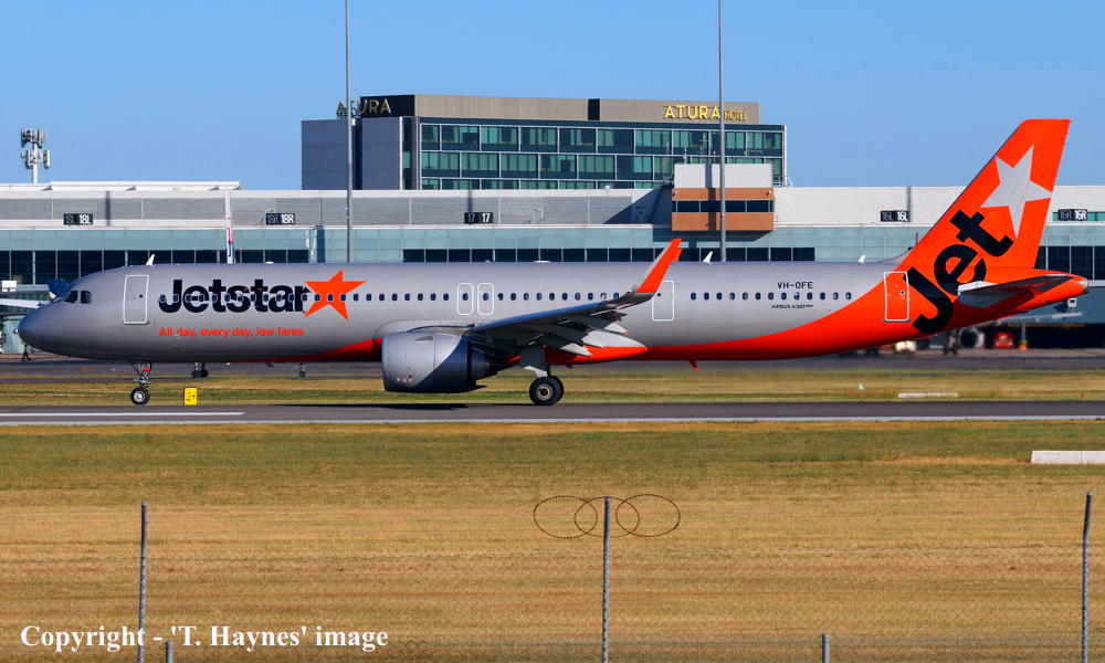 VH-OFE. Jetstar - in the revised livery at Sydney Kingsford Smith Airport, April 19, 2023. (F. McGuire Copyright Image 0321-386.) |