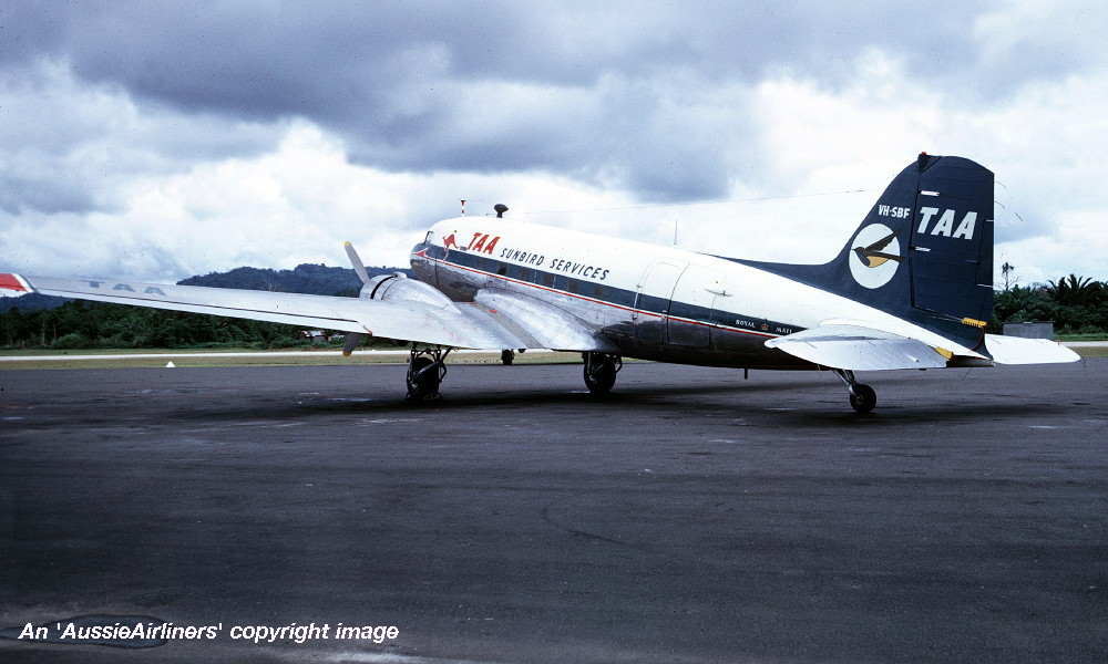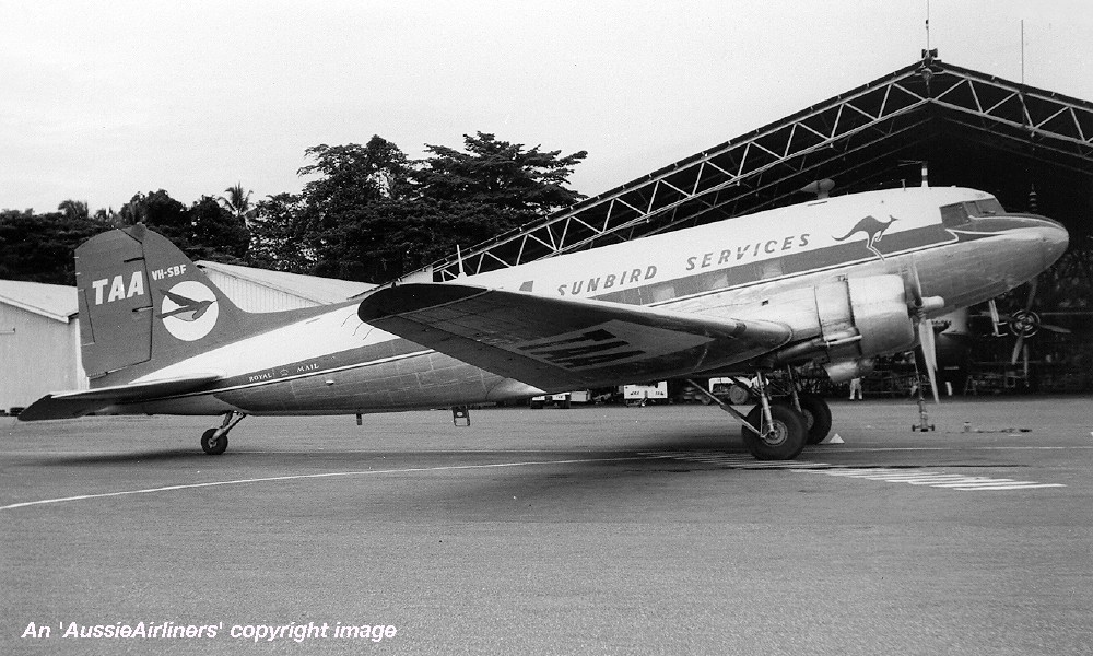 VH-SBF. TAA Sunbird Services - in the standard livery at Lae Airport, date unknown. (R. N. Smith Collection Copyright Image 0250-110.) |