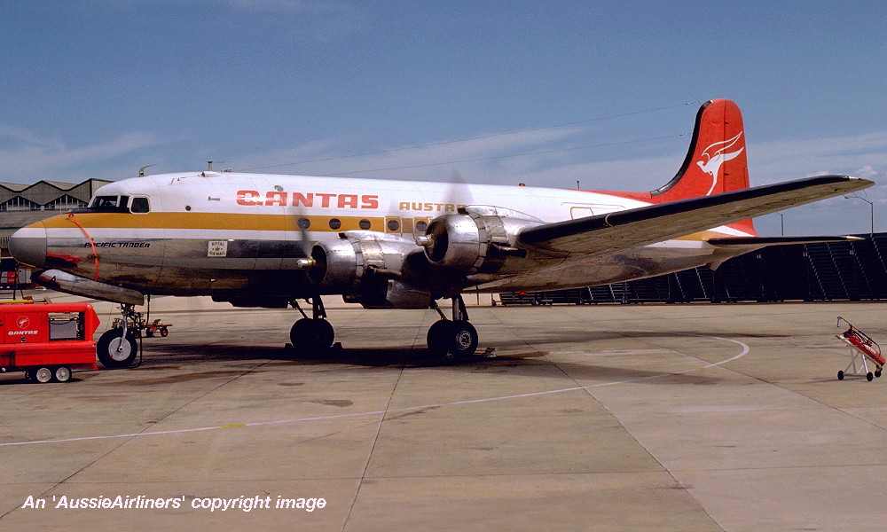 VH-EDA. Qantas Australia - 'Pacific Trader' in the 'ochre' livery at Sydney Kingsford Smith Airport, February 27, 1977. This was the final Qantas Douglas DC-4 service to Norfolk Island. (G. Wilkes Copyright Image 1125-129.) |