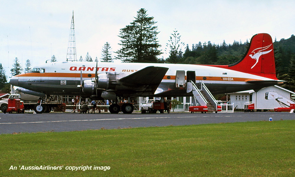VH-EDA. Qantas Australia - 'Pacific Trader' in the 'ochre' livery at Norfolk Island, December 1975. (R. N. Smith Copyright Image 1125-187.) |