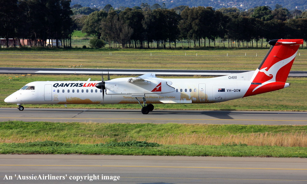 VH-QOW. QantasLink - 'Taronga' in the 'New Roo' livery with additional 'Western Plains Zoo Dubbo' titles and decals at Sydney Kingsford Smith Airport, May 08, 2011. (S. Jaworski Copyright Image 2923-318.) |