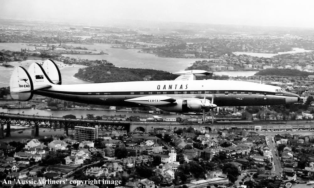 VH-EAD. Qantas - 'Southern Dawn' in the standard livery over Sydney, circa 1958. (Qantas Heritage Collection Copyright Image 1802-081.) |