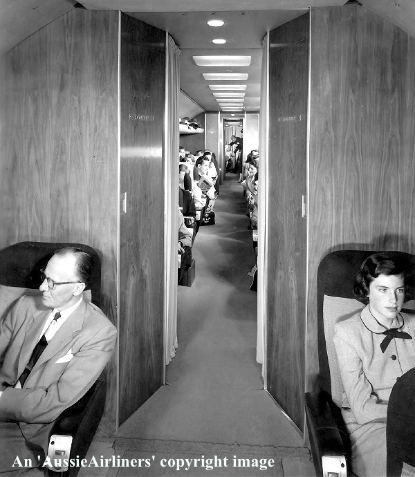 VH-EAF. Qantas - 'Southern Wind' at Sydney Kingsford Smith Airport, circa 1958. Inside the forward cabin looking aft. (Qantas Heritage Collection Copyright Image 1802-146.) |