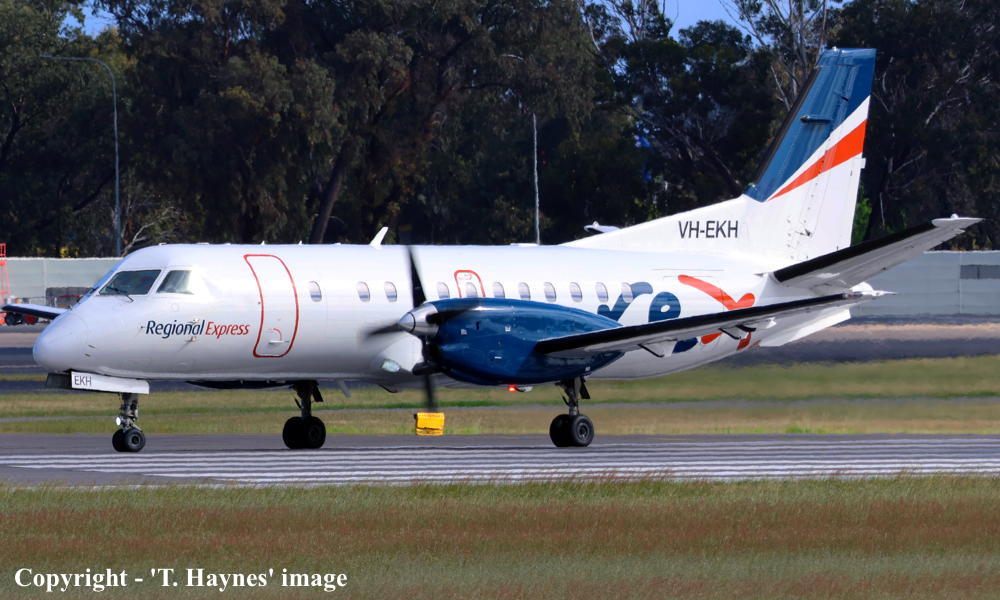 This aircraft was built by Saab Aircraft AB, Linkoping, Sweden - 1995 First flown with the test registration 'SE-C69' - May 22, 1995 Powered by General Electric CT7-9B turboprop engines Entered onto the Australian Aircraft Register as VH-EKH - May 29, 1995 Registered to Kendell Airlines (Australia) Pty Ltd, Wagga Wagga, Australia Accepted by Kendell Airlines at Linkoping - June 1995 Kendell Airlines had been purchased by TNT / News Ltd, the parent company of Ansett Airlines - June 1990 Swedish test registration cancelled - June 29, 1995 Departed Linkoping, Sweden on the delivery flight to Australia - June 29, 1995 It arrived at Wagga Wagga on completion of the delivery flight from Sweden - July 05, 1995 This aircraft was not named Operated its first revenue service Wagga Wagga - Sydney (Kingsford Smith) - July ?, 1995 Ansett suspended all operations due to bankruptcy - September 13, 2001 Operated its last revenue service Coffs Harbour - Sydney (Kingsford Smith) as AN5919 - September 14, 2001 The aircraft was stored at Sydney (Kingsford Smith) Returned to service under administration Sydney (Kingsford Smith) - Canberra - October 08, 2001 Kendell Airlines was sold to Australiawide Airlines operating as Regional Express Airlines (REX) - August 01, 2002 Operated its first revenue service with REX - August 05, 2002 Registered to Australiawide Airlines Ltd - September 19, 2002 Registered to Swedish Aircraft Holdings AB, Sweden - May 11, 2006 Leased to Regional Express Holdings as registered operator Registered to Regional Express Holdings Limited, Mascot, Sydney - April 07, 2011 Leased to Regional Express Pty Ltd, Mascot, Sydney as the registered operator - January 30, 2014 Current with the Regional Express Airlines |