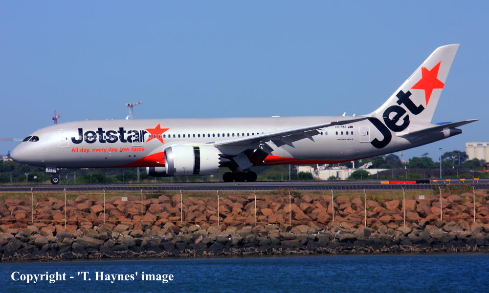VH-VKI. Jetstar - in the standard livery at Sydney Kingsford Smith Airport, November 20, 2016. (T. Haynes Copyright Image 4680-219.) |