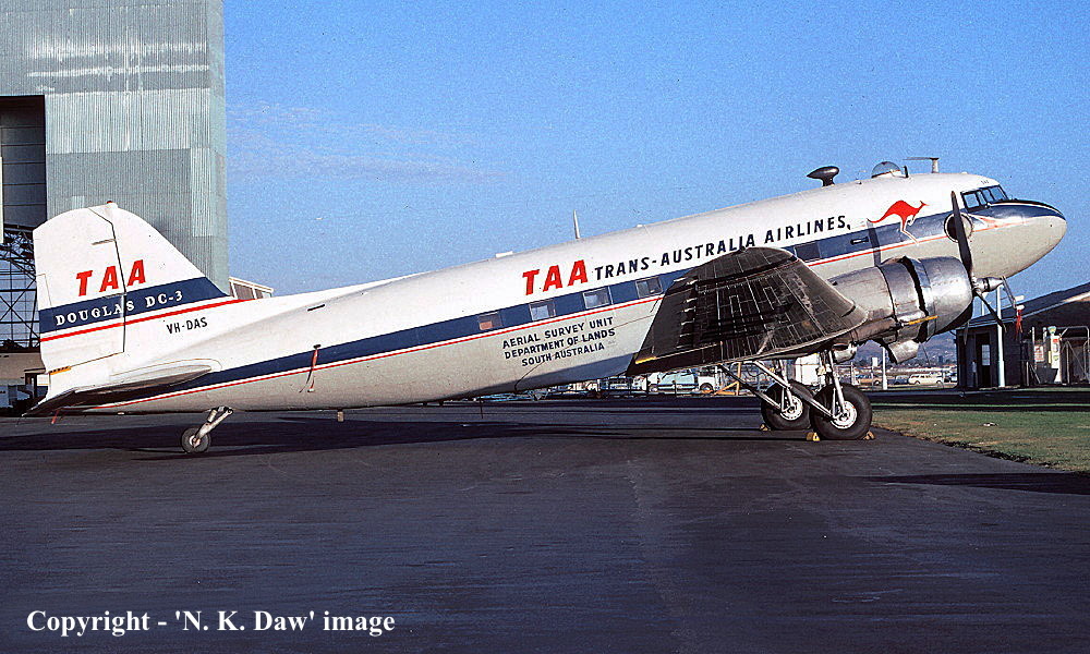 VH-DAS. TAA Trans-Australia Airlines - 'Cunningham' in the standard livery with additional 'Aerial Survey Unit Department of Lands South Australia' titles at Adelaide West Beach Airport, April 1972. (N. K. Daw Copyright Image 0250-917.) |